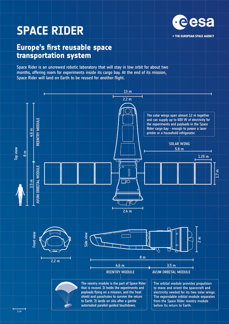 Po wyniesieniu na nisk± orbitê oko³oziemsk± (LEO) s³u¿yæ bêdzie jako laboratorium kosmiczne dla ró¿norodnych eksperymentów, wynoszenia satelitów, zwiadu i inspekcji innych satelitów oraz operacji robotycznych (np. naprawy). Dostarczaæ bêdzie móg³ tak¿e ³adunki na Miêdzynarodow± Stacjê Kosmiczn± (ISS) - bez dokowania. PowstawanieSpace Rider jest nastêpc± testowego europejskiego miniwahad³owieca Intermediate eXperimental Vehicle (IXV).